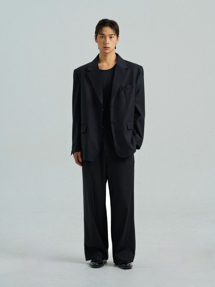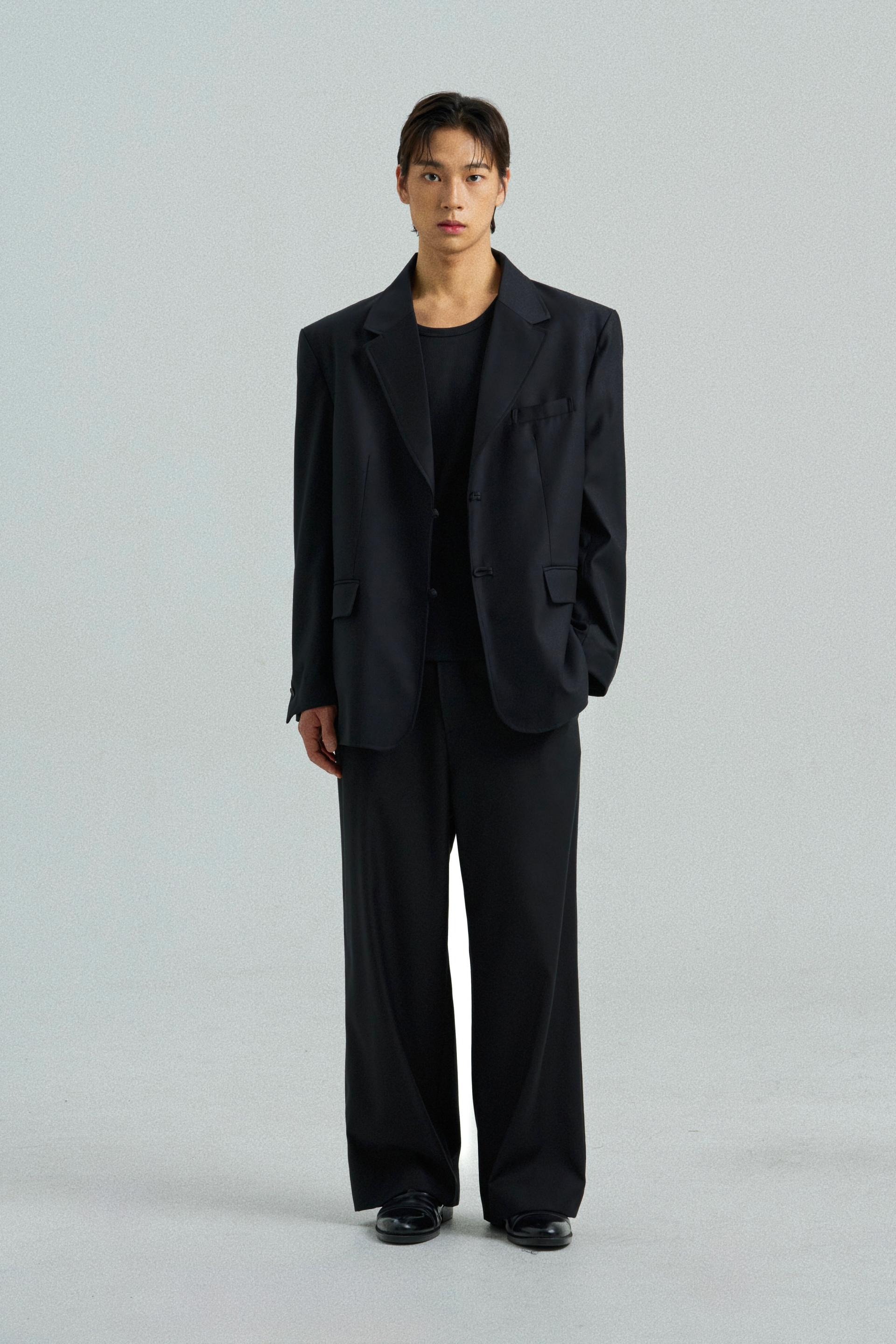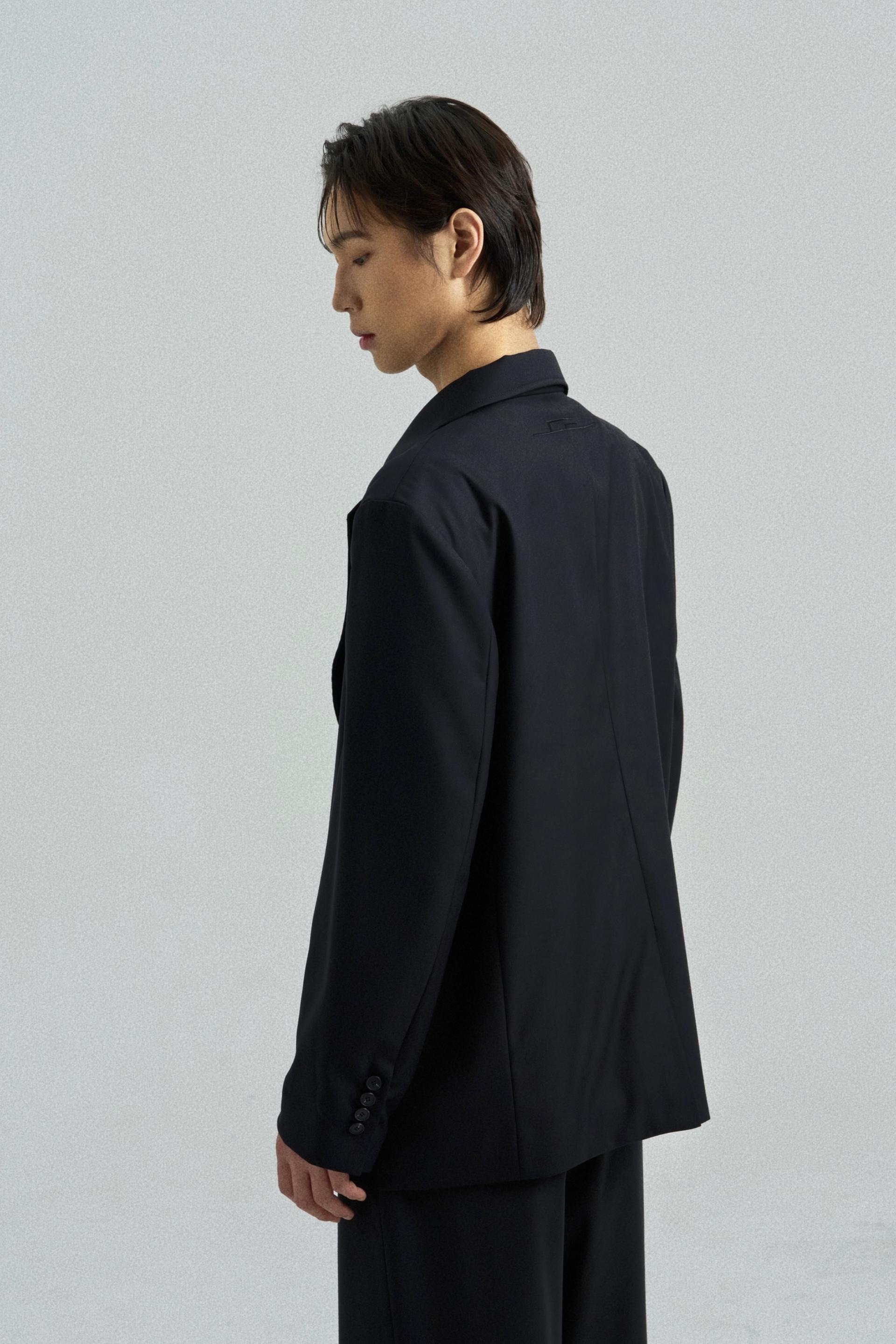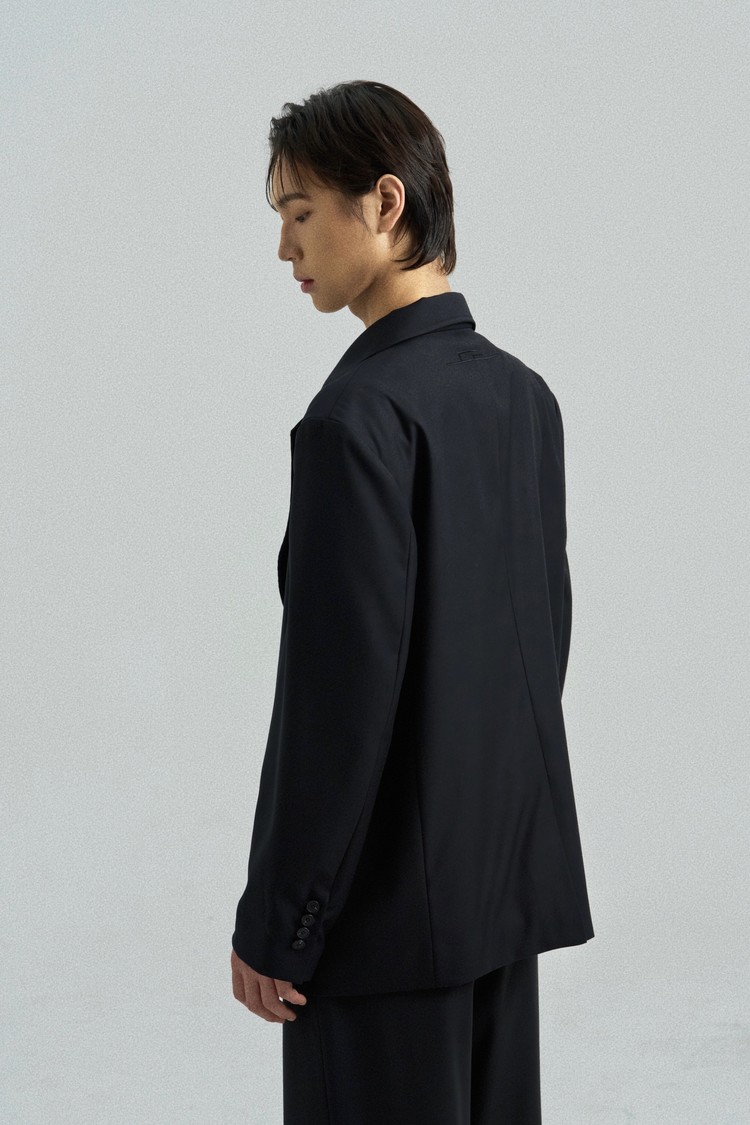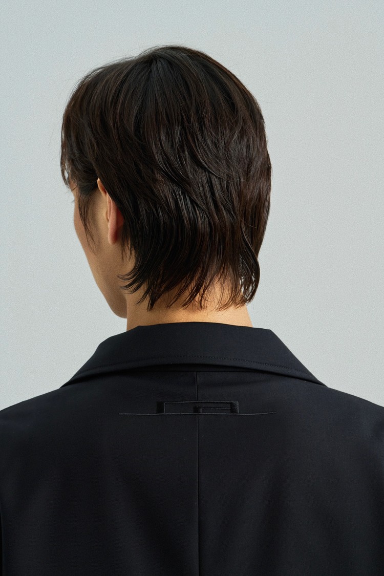 This tailored blazer features a traditional goreum closure in place of buttons, integrating hanbok detailing into a modern structure.