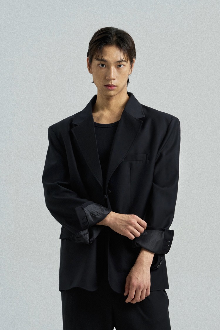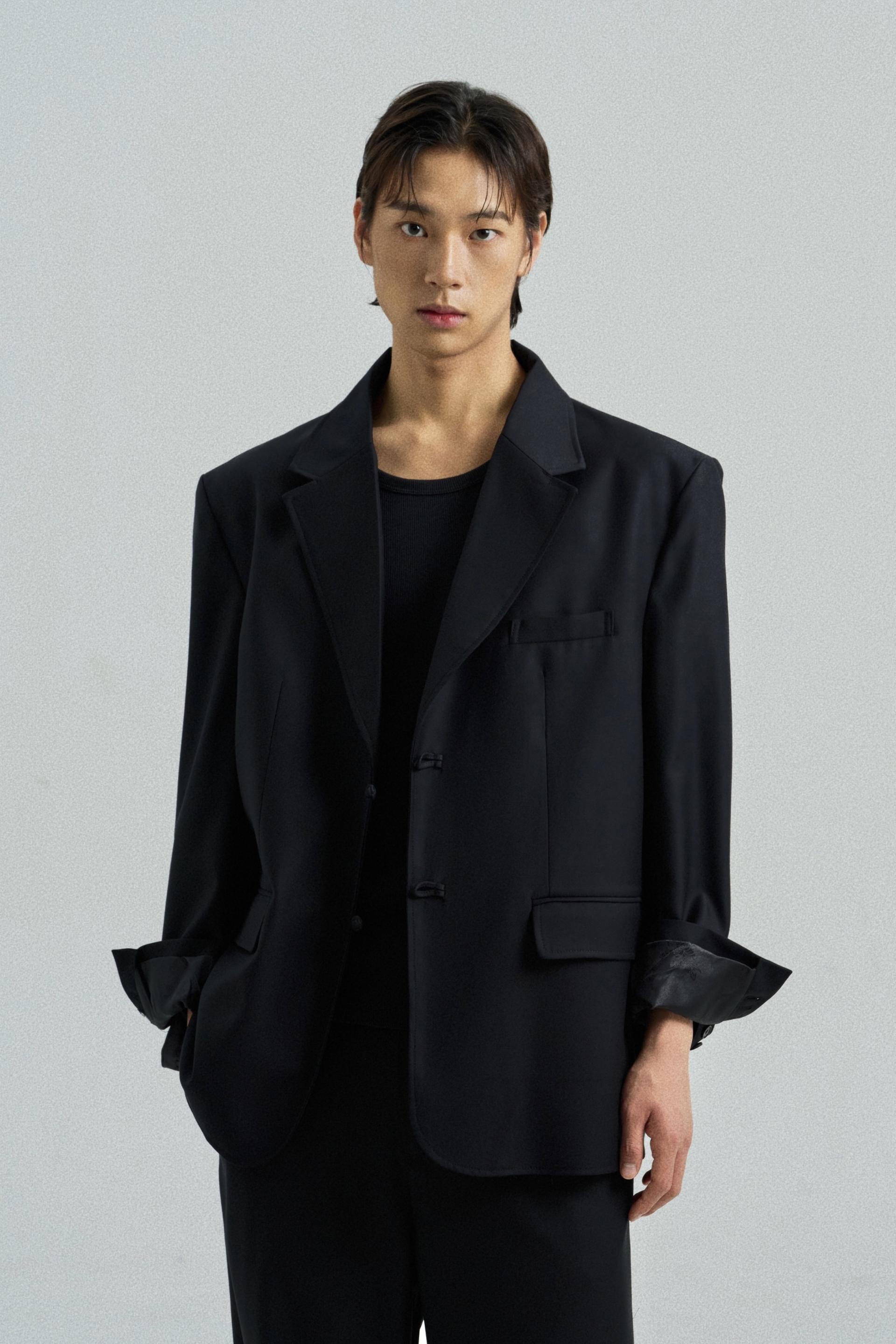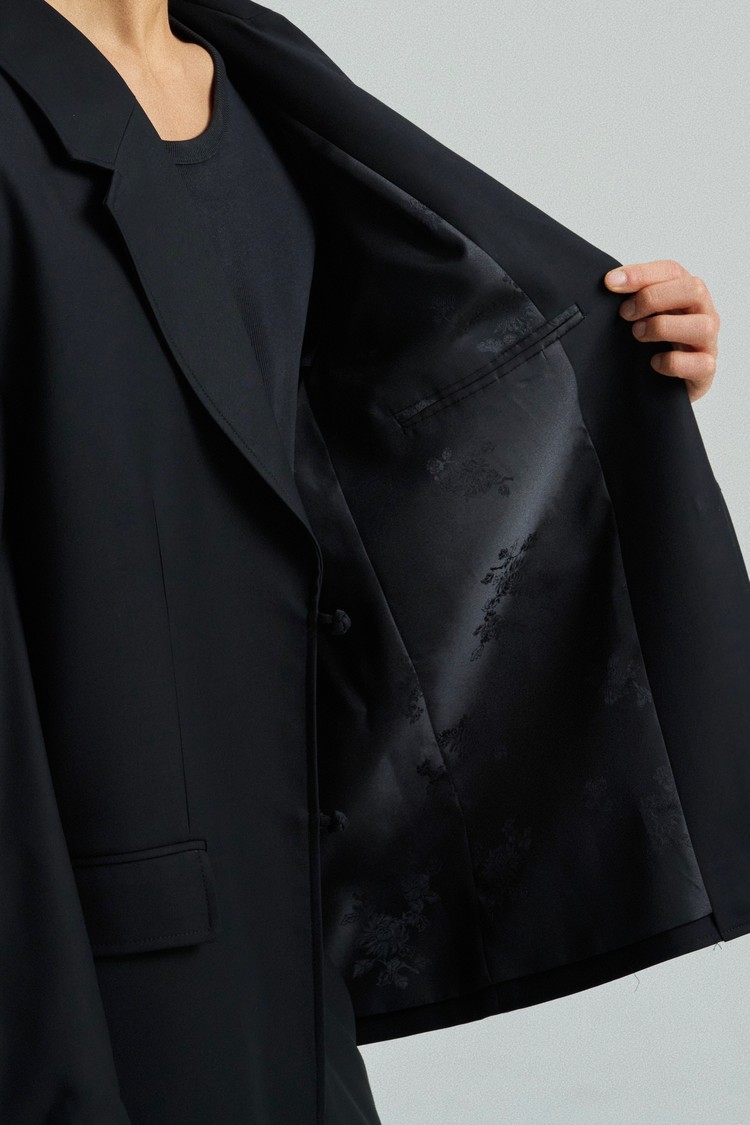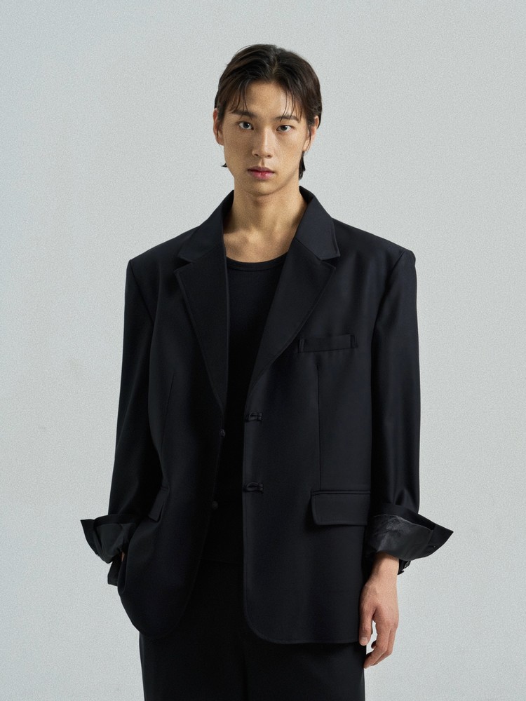 A tailored blazer fastened with a traditional goreum knot in place of buttons.
