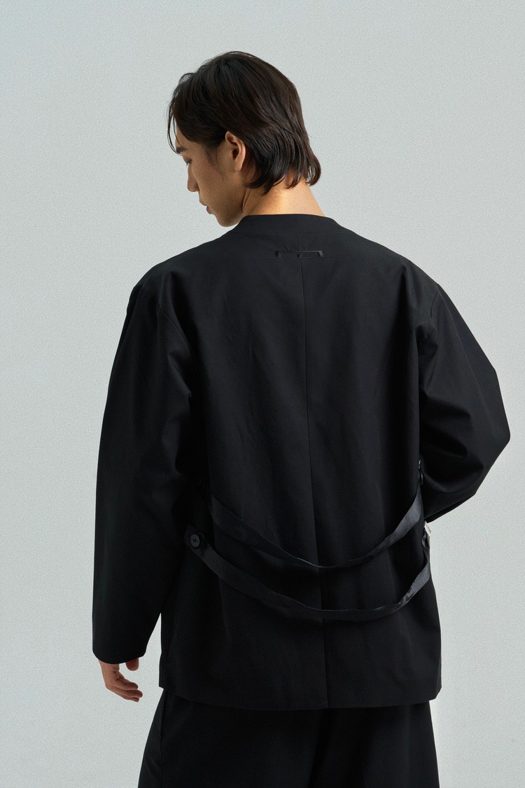 A concealed button system enables three styling options—worn outward, concealed, or secured at the back—allowing effortless transitions from formal tailoring to a contemporary mood.