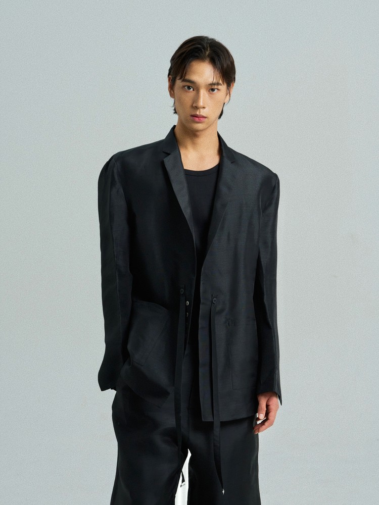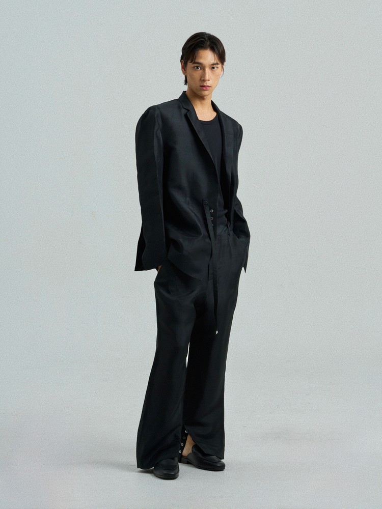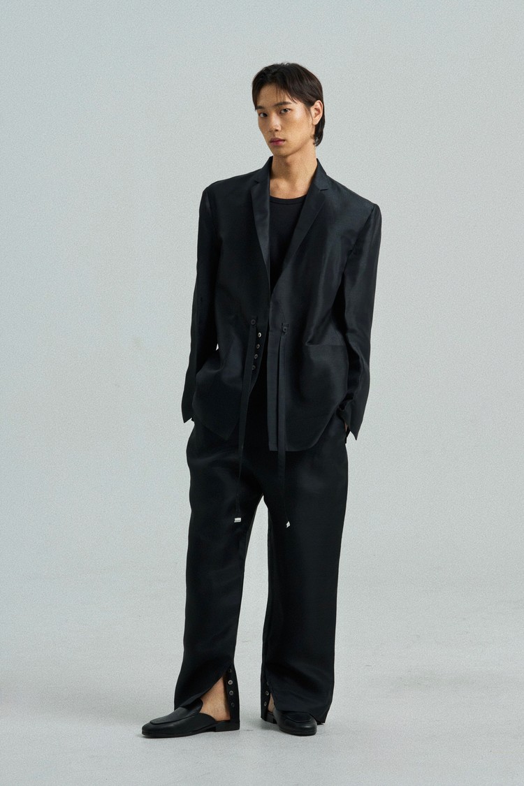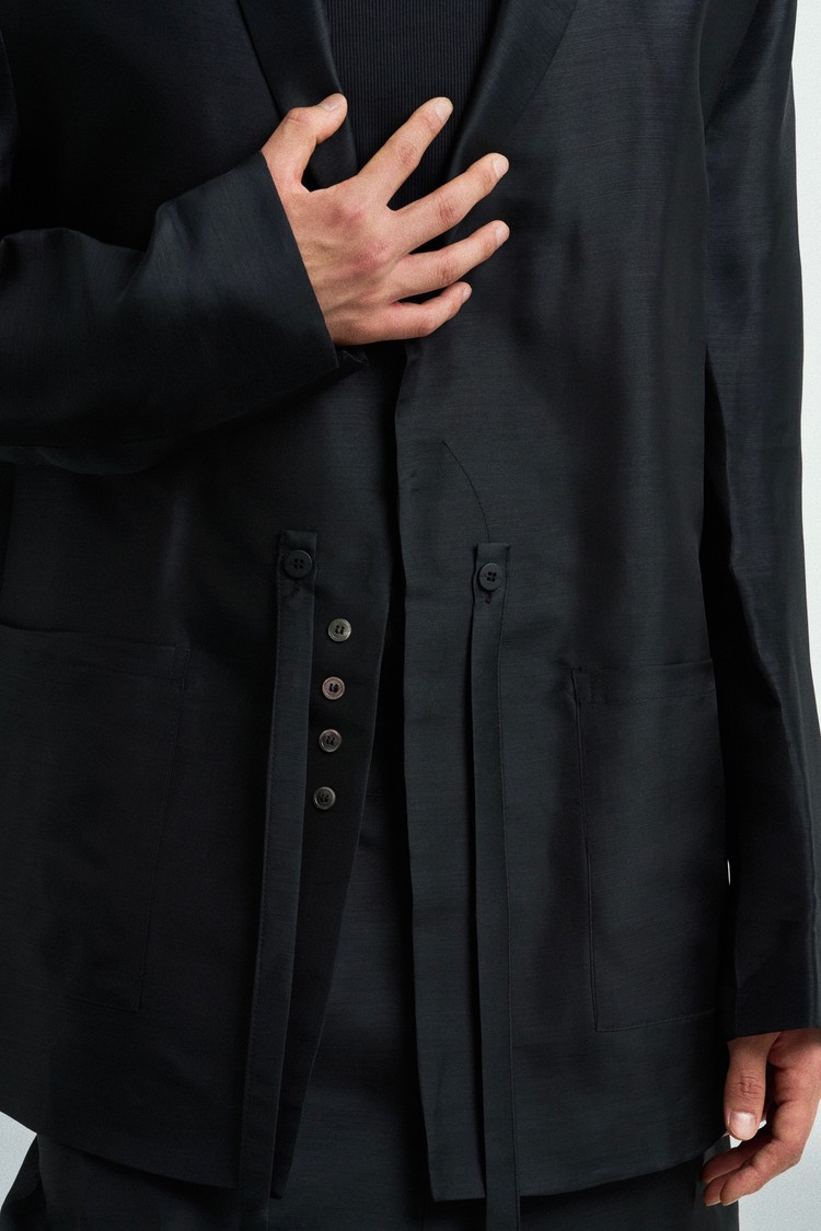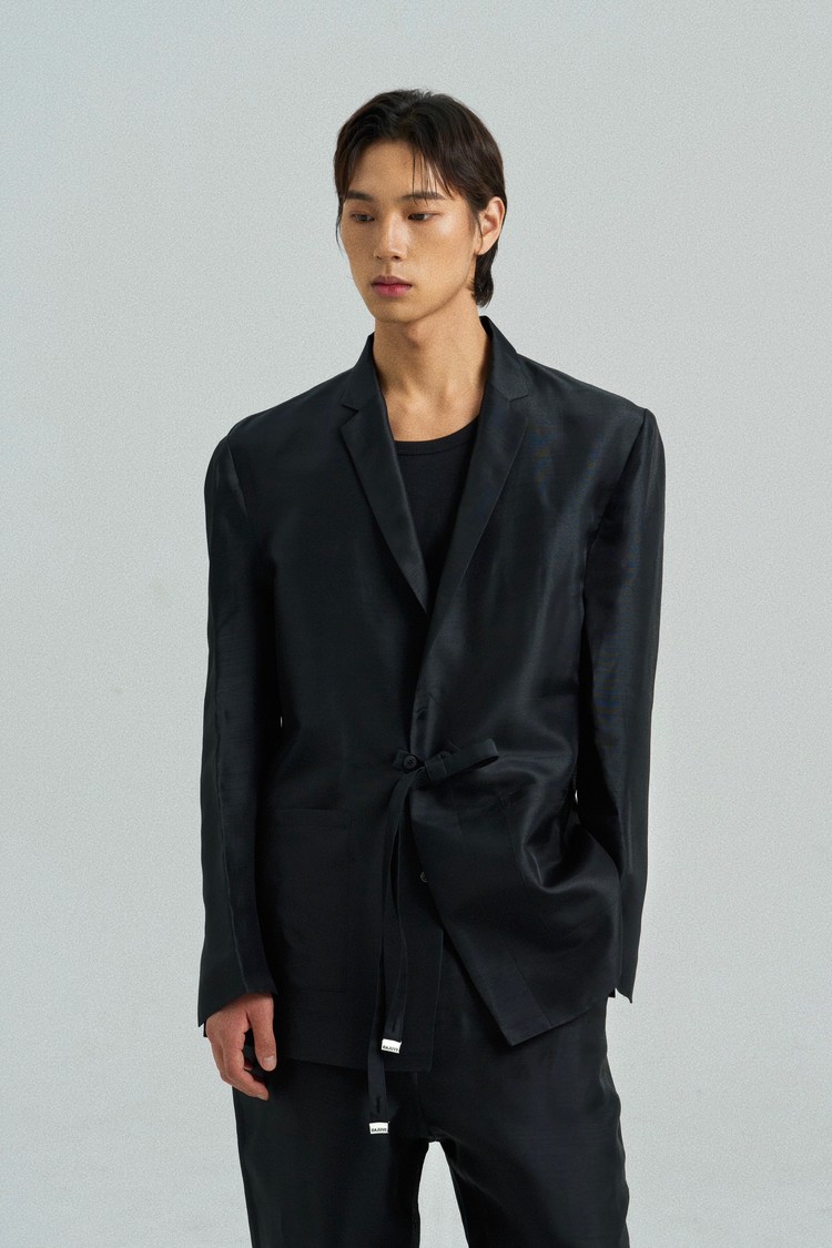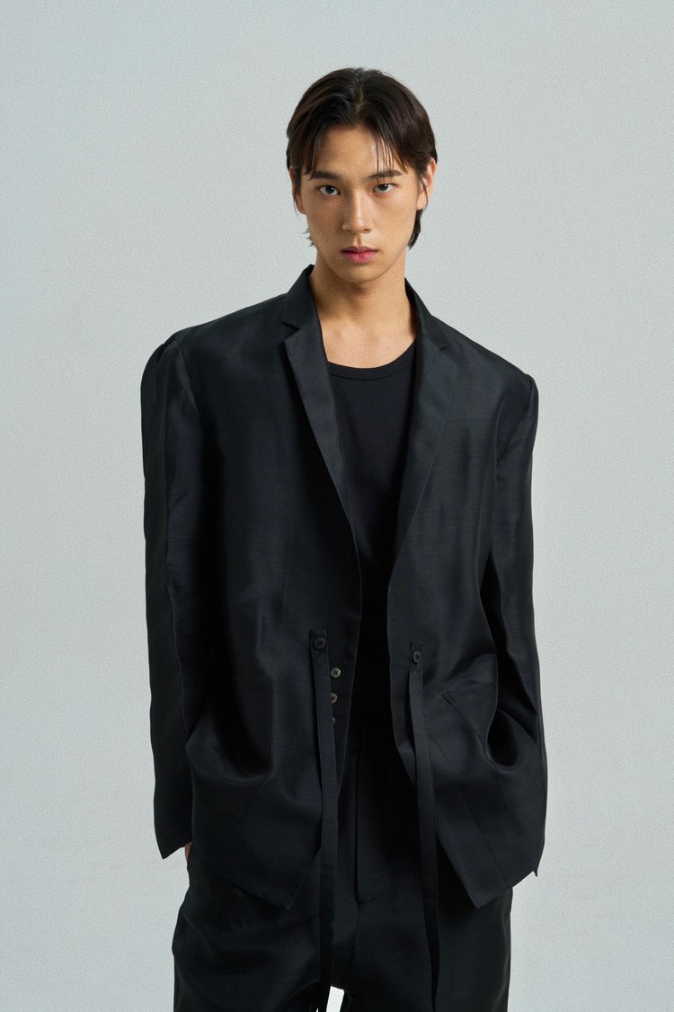 Replacing conventional buttons, a knotted closure reinterprets traditional detailing through a contemporary lens, while the balance of structured tailoring and relaxed volume allows Korean elegance and minimalist beauty to coexist with quiet refinement.